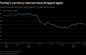 The buffer against such a crisis is thin: a costly and unorthodox policy in 2019-2020 of selling some $128 billion in dollars to support the lira has depleted the central bank’s FX reserves by about 75%.