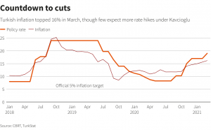 The lira’s slide, along with higher oil prices, has meanwhile raised import prices and pushed inflation up to 16.2% in March. Wall Street banks predict it will reach as much as 19% this quarter, keeping basic living costs high for Turks hit by the pandemic and joblessness. (Graphic: Turkey’s currency reserves have dropped again, )