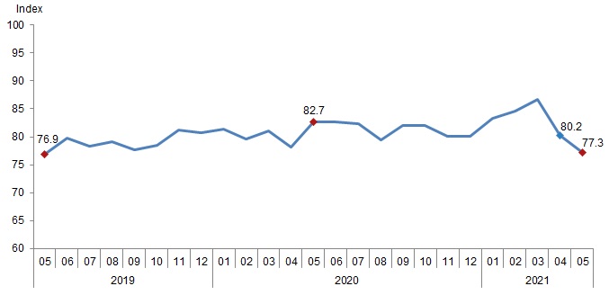 The financial situation expectation of household index in the next 12 months: decreased by 5.5% to 76.6 in May from 81.0 in April.