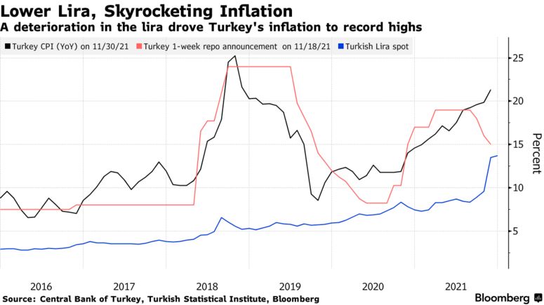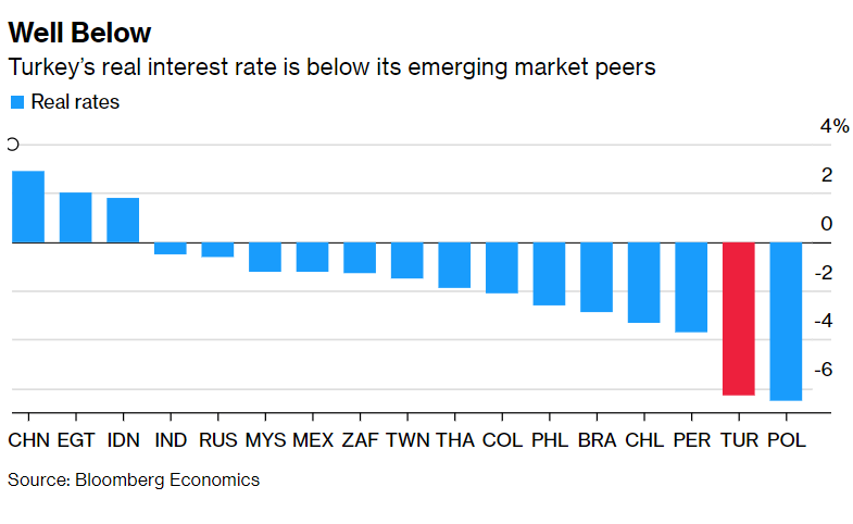 A Real Low: The CPI inflation rising above 21% versus the policy rate of 15% in November pushed Turkey’s real yield further into negative territory and well below emerging market peers. Bloomberg adds that has already prompted foreign investors to ditch Turkish bonds and the lira in favor of higher returns elsewhere leaving Turkey in a worse position when the U.S. and other major economies eventually tighten monetary policy. Erdogan claims that’s a price he’s willing to pay to break the hold of markets on monetary policy.