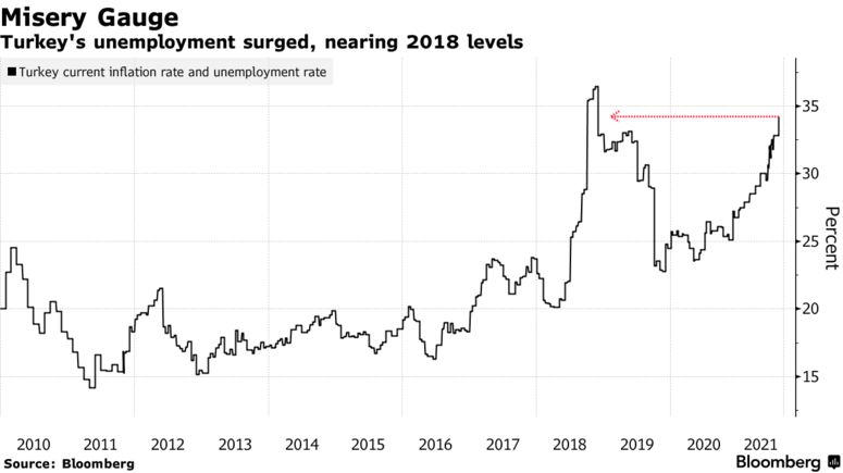 Economic Misery: Bloomberg reminds that in contrast to Erdoğan’s calls with TL losing almost 40% of its value against the dollar this year CPI inflation surged to a 3-year high, while producer prices rose to their highest level since the start of Erdogan’s 19-year rule. Hence Turkey’s Misery Index, a measure of joblessness combined with cost of living, has been rising since the pandemic and climbed sharply even as the economy rebounded this year.