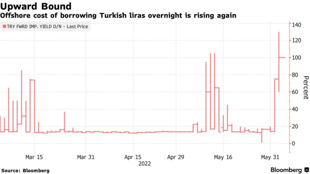 The overnight forward-implied yield on the lira is already around 100% and the cost of borrowing in the offshore market may rise further if the latest measure proceeds.