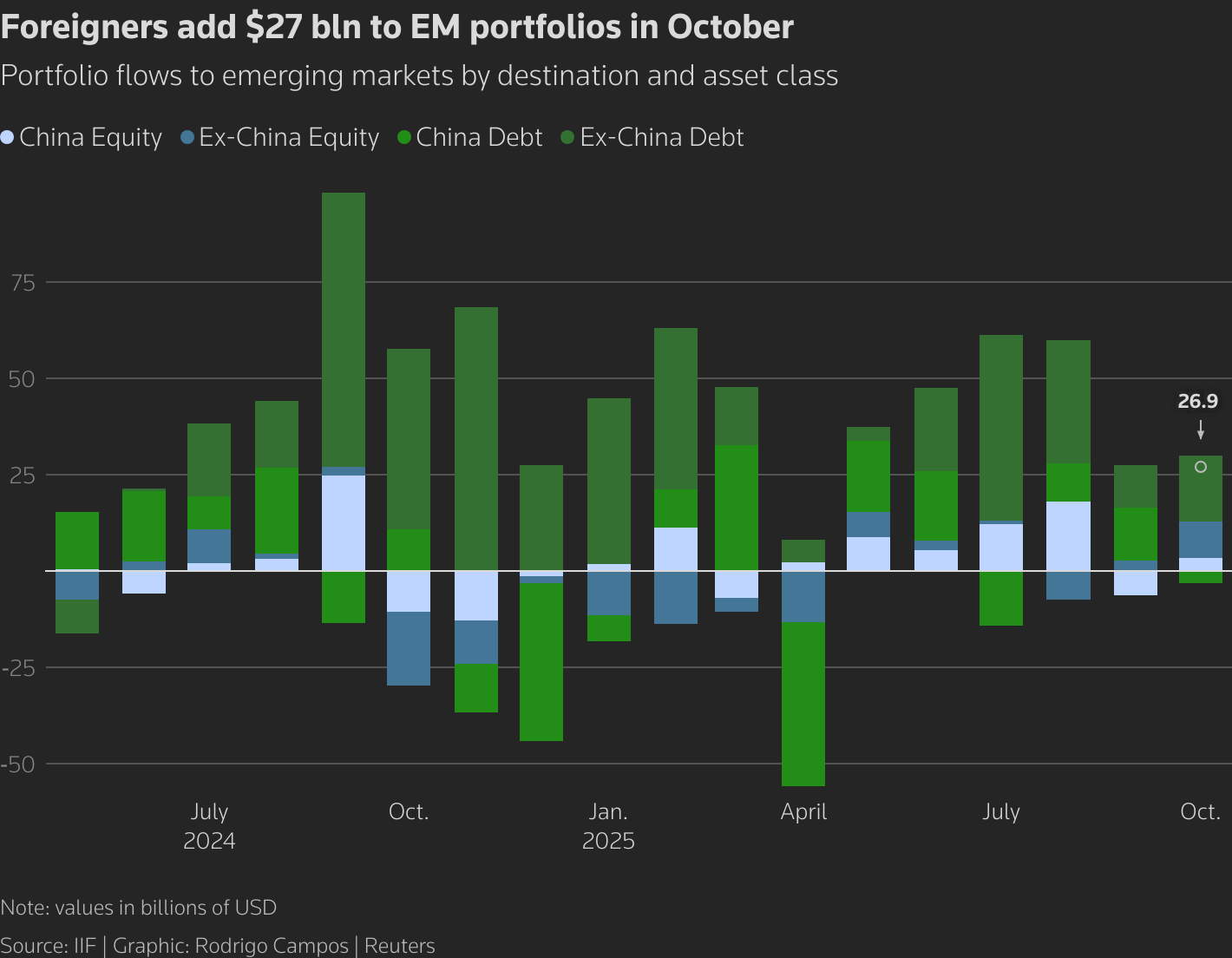 Emerging Markets, Finance, HIGHLIGHTS 3 weeks ago Foreign Investors Pour $27 Billion into Emerging Markets in October — IIF