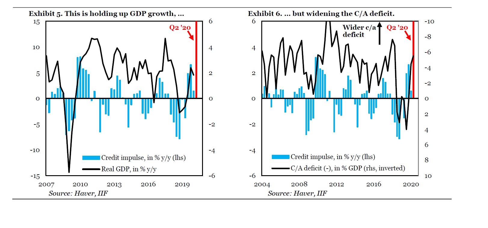 The largest ever credit expansion, bigger than 2017, is supporting economic activity in the face of COVID-19. But that credit expansion is also one reason the current account deficit has widened to levels last seen ahead of the BoP sudden stop in August 2018, putting downward pressure on official reserves and the Lira. Unfortunately, this means policy makers face an unappealing trade-off. They can push for high growth via credit expansion, but that will likely entail further declines in reserves and the Lira. Or they can decide to put the emphasis on shoring up reserves and Lira stability, which will come at the expense of growth. Ultimately, it is impossible for Turkey to maintain strong credit-led growth and a stable Lira.