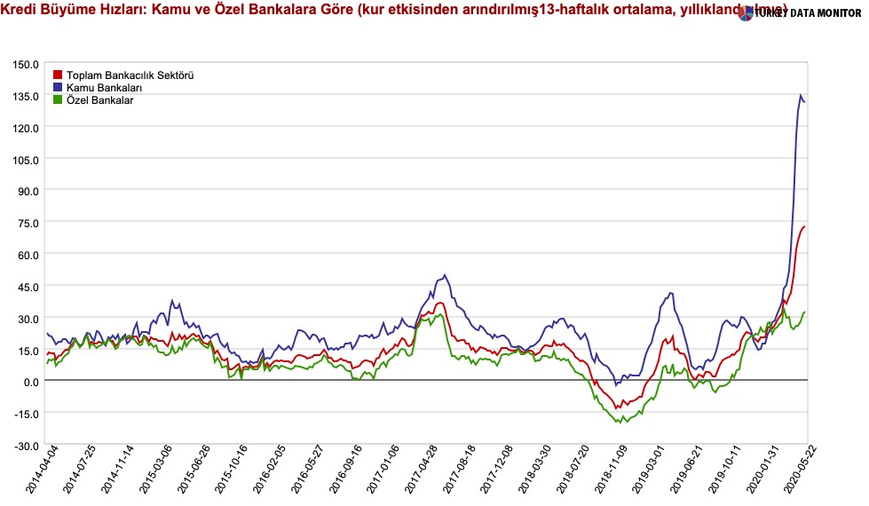 Total loans of the Turkish banking system rose by 18%, YTD, with credit momentum (Central Bank’s measure:  13-week moving average change in total loans) soaring to an eye-opening  72% per annuum. Thanks to the easing of macro-prudential rules by banking regulator BRSA, bad loans remained at 4.8% of the total portfolio.  Despite this abnormal expansion of credit at a time when IMF expects Turkish GDP to decline by 5% in 2020, only to partially recover its losses in 2021, the government wants faster loan growth. Four state banks unveiled a subsidized loan scheme on Friday for those who wish to buy houses, domestic cars or to vacation. BRSA “fine tuned” its infamous Asset Ratio over the weekend, to force private banks to make even more loans, damn the credit risk.  This cavalier attitude towards the loan boom  didn’t escape the attention of rating agencies, with Moody’s issuing a damming report about the future of the industry.