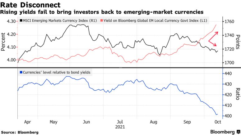 A gauge of developing-nation currencies has sunk to the weakest level since March 2020 relative to average local-bond yields. That suggests investors are discounting the appeal of rising interest rates, fretting instead over the toxic combination of slower global growth and faster inflation.