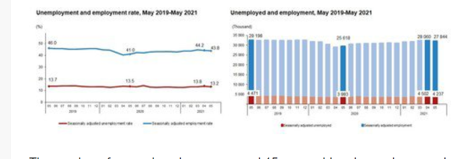 The number of people employed decreased by 216 thousand people in May 2021 compared to the previous month to fall to 27 million 844 thousand people, while the employment rate fell by 0.4 points to 43.8 percent. The workforce fell by 481 thousand people in the same month compared to April, declining to 32 million 81 thousand people, while the labor force participation rate decreased by 0.8 points to 50.5 percent. As a result, the headline unemployment rate dropped to 13.2%.