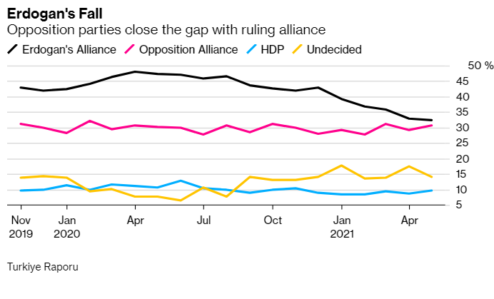 The increasing perception that the economy is being mismanaged, along with the opposition’s campaigns on central bank reserves, are the leading factors for the erosion in support, said Ozer Sencar, head of Metropoll. Erdogan’s crowded rallies in the midst of strict coronavirus measures and a decision to exempt tourists from lockdowns were among other reasons, according to Sencar and Turkiye Raporu.