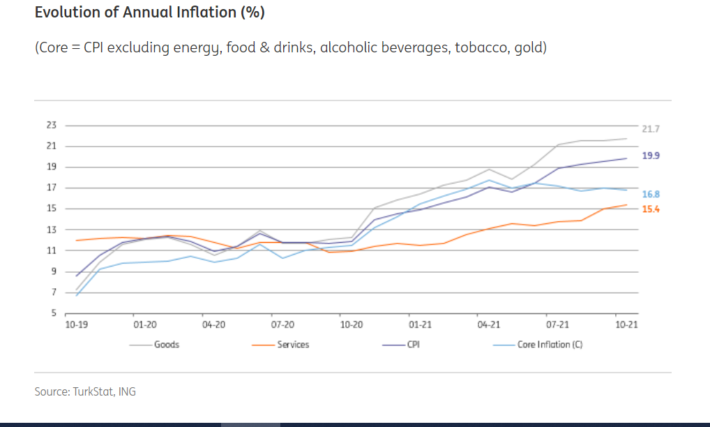 Monthly CPI in October was 2.39%, lower than the consensus at 2.76% (slightly higher than our call at 2.3%), while annual inflation rose to 19.9%. Both ‘B’ (excluding unprocessed food, energy, alcoholic beverages, tobacco and gold ) and ‘C’ (excluding energy, food and non-alcoholic beverages, alcoholic beverages, tobacco and gold) core inflation indices moderated to 18.5% and 16.8%, but remained elevated.