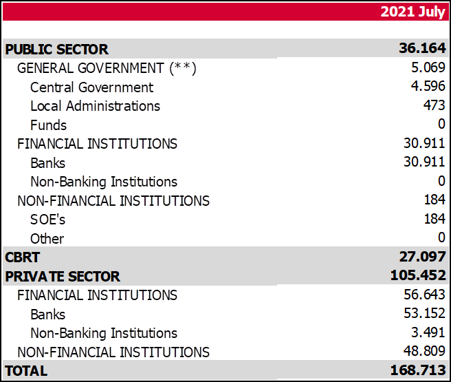 - Short-term external debt stock recorded USD 125.3 billion at the end of July, indicating an increase of 9.7 percent compared to the end of 2020. Specifically, in this period, banks’ short-term external debt stock increased by 2.6 percent to USD 58.9 billion and other sectors’ short-term external debt stock increased by 10.8 percent to USD 39.4 billion.