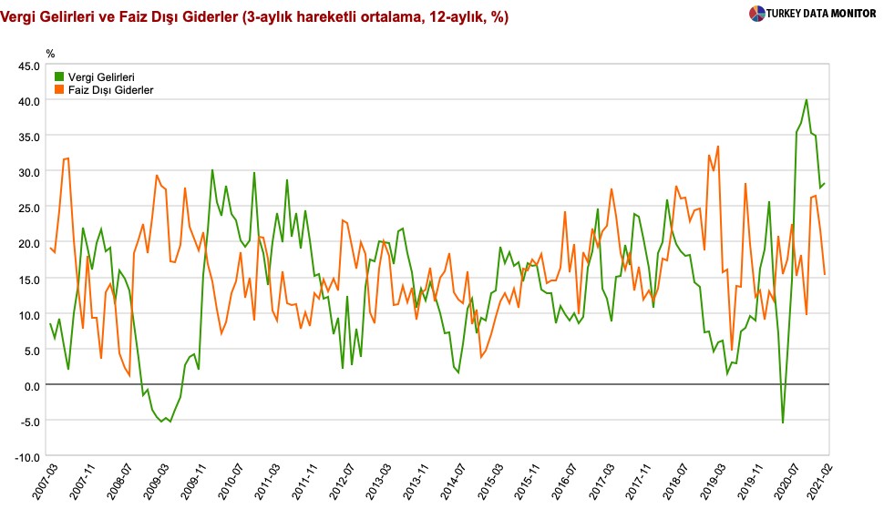 Budget gave a deficit of TL 7.4bn in Feb.20 (Jan.21: TL-24.2bn). Accordingly, the budget gave a deficit of TL1bn in 2M21 (2M20: TL+14.1bn). 12-month rolling budget deficit decreased from TL218.4bn in January to TL187.9bn in February (-3.7% of GDP, official target: TL -245bn, budget/GDP:-4.3%, revised budget/GDP target:-3.5%). Additionally, the primary balance posted a surplus of TL35.9bn in February (Feb.20: TL+6.8bn, Jan.21: TL-2.2bn). Hence, primary surplus was TL33.7bn in 2M21 (2M20:TL+41bn). 12-month primary deficit decreased from TL75.2bn to TL46.1bn (-0.9% of GDP, official target: TL-65.5bn, primary balance/GDP target: -1.2%).