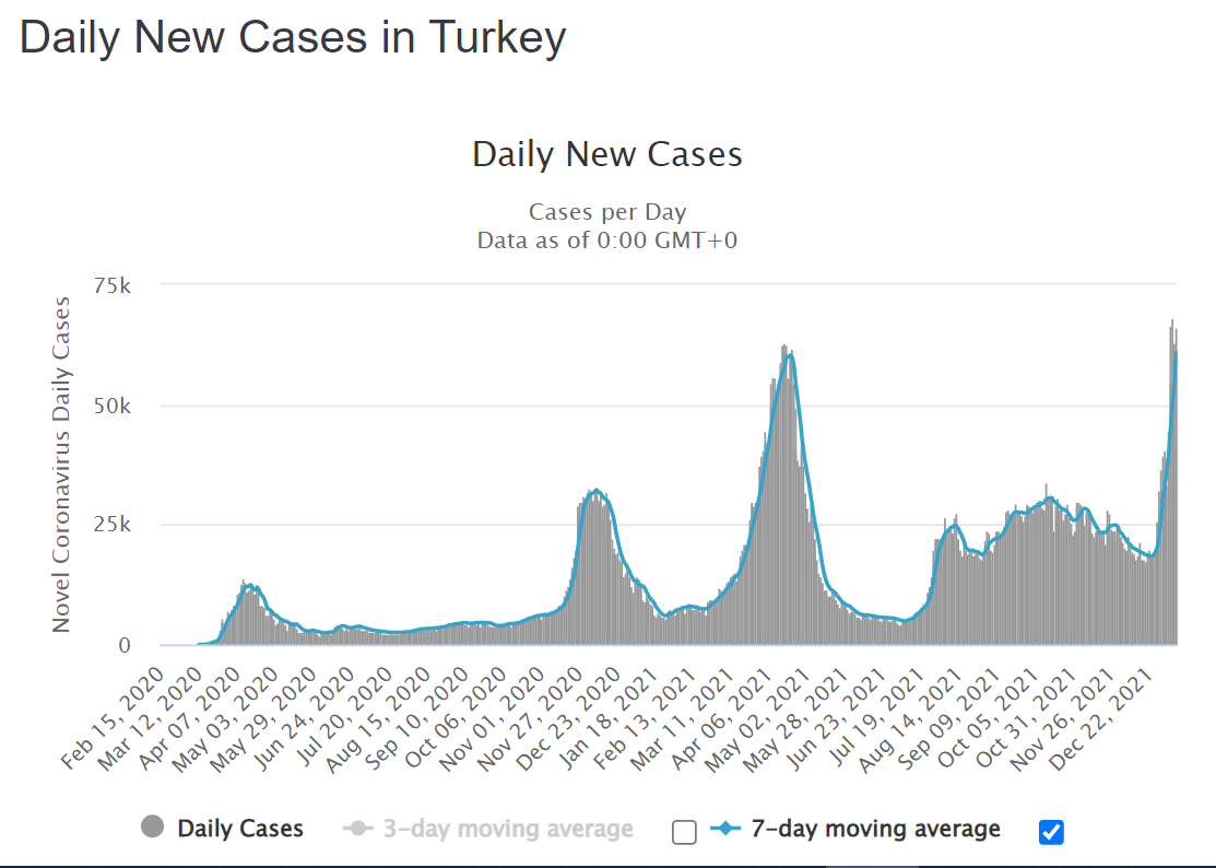 Turkey on Wednesday reported its highest number of daily COVID-19 infections since the start of the pandemic at 66,467 as the rapidly-spreading omicron variant takes hold.