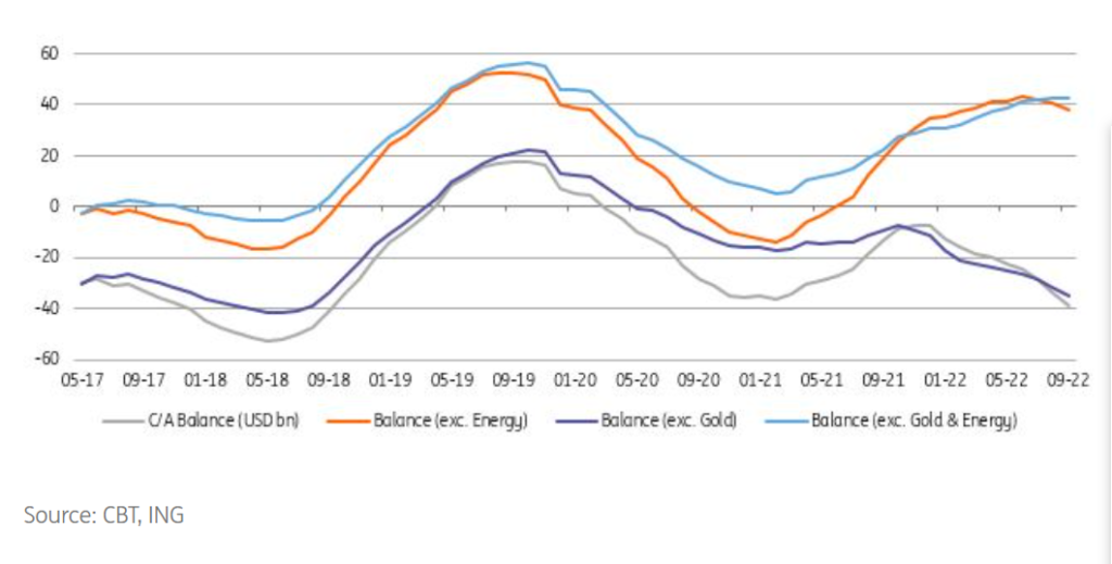 Despite large revisions to the balance of payments data, which significantly raised tourism revenues, the current account continued to widen rapidly in September, driven by a notable pick-up in the energy bill and gold imports, wrote ING analysts.