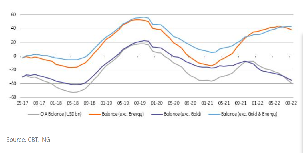 Despite large revisions to the balance of payments data, which significantly raised tourism revenues, the current account continued to widen rapidly in September, driven by a notable pick-up in the energy bill and gold imports, wrote ING analysts.