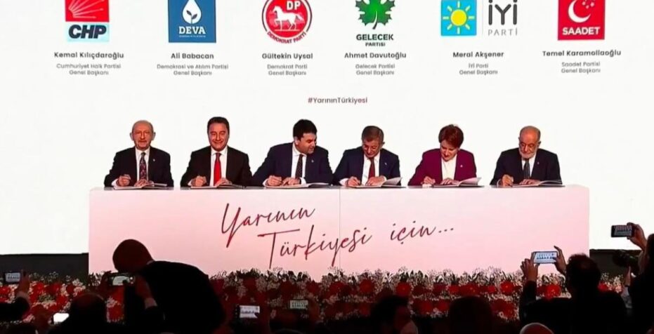 The memorandum of understanding was signed by the main opposition Republican People’s Party (CHP), İYİ Party, Felicity Party (SP), Democrat Party (DP), Future Party and DEVA Party at a ceremony attended by the party leaders Kemal Kılıçdaroğlu, Meral Akşener, Temel Karamollaoğlu, Gültekin Uysal, Ahmet Davutoğlu and Ali Babacan, respectively.