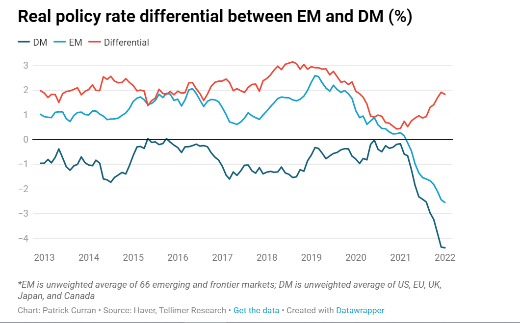 That said, policy rates in DM have been much more static and the rise in inflation even greater, with the unweighted average policy rate across our sample of five major DM central banks (the Fed, ECB and Banks of England, Japan and Canada) rising by just 3bps last year (with a lone 15bps hike by the Bank of England in December, plus out-of-sample hikes of 25bps by Norway and 50bps by New Zealand) versus a rise in inflation to 4.5% from just 0.2% at the end of 2020. This has pushed the differential between EM and DM real policy rates from a decade low of 0.4% at the end of last year to 1.8% in September, broadly in line with the average of c2% over the past decade.