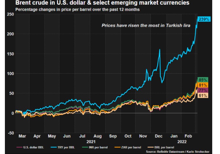 For the big emerging market economy that imports almost all its energy needs, it is a second straight shock after Erdogan’s own push for interest rate cuts triggered a currency crisis in December that sent inflation to 54% and rocked households.