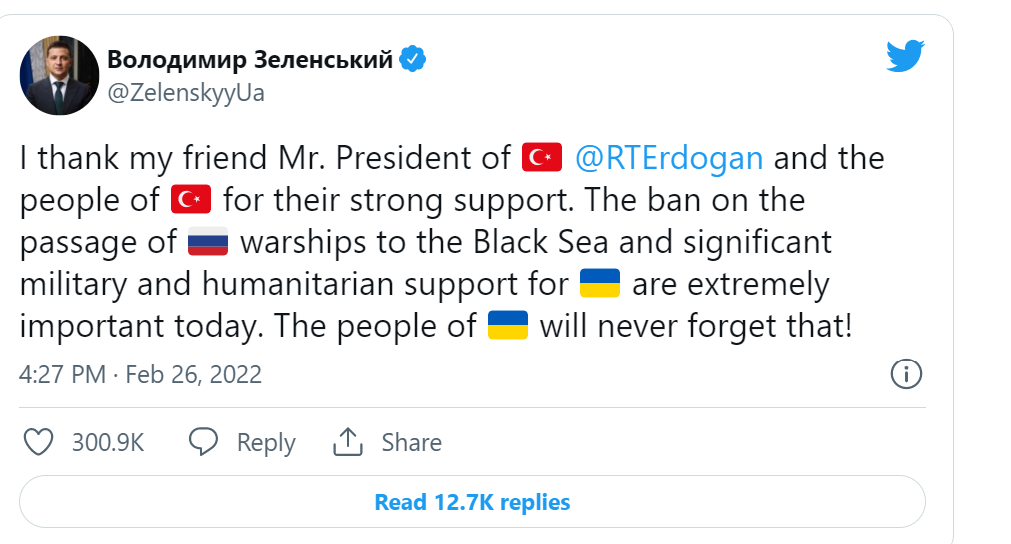 “I thank my friend Mr President of Turkey @RTErdogan and the people of Turkey for their strong support,” Zelensky tweeted.