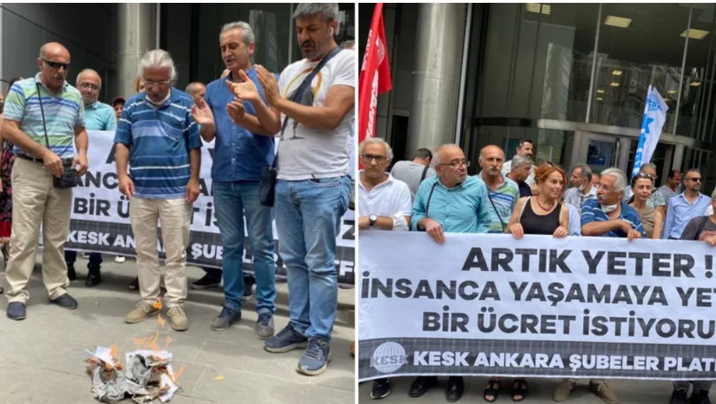 Members of the Confederation of Public Employees Trade Unions (KESK) on July 18 burned their payrolls to protest their financial difficulties in the face of soaring inflation and melting wages.