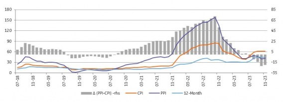 With another better-than-expected monthly reading at 3.3% (vs the consensus at 3.9% and our call at 3.8%), annual inflation in Turkey recorded a slight increase to 62% from 61.4% a month ago. The data reflect elevated upward pressures in services and the impact of natural gas prices. October PPI, on the other hand, stood at 2.8% MoM, translating into 42.2% YoY. The decline in annual PPI from close to triple digits at the end of last year shows improvement in cost pressures despite a Year-on-Year increase in the Turkish Lira equivalent of import prices lately due to commodity price developments and exchange rate increases.