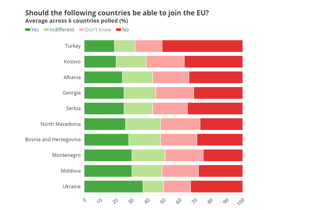But a majority of respondents (51%) oppose Turkey joining the EU and opinion is divided on many Western Balkan countries – more than one in three oppose EU accession for Kosovo (37%), Serbia (35%) and Albania (35%).