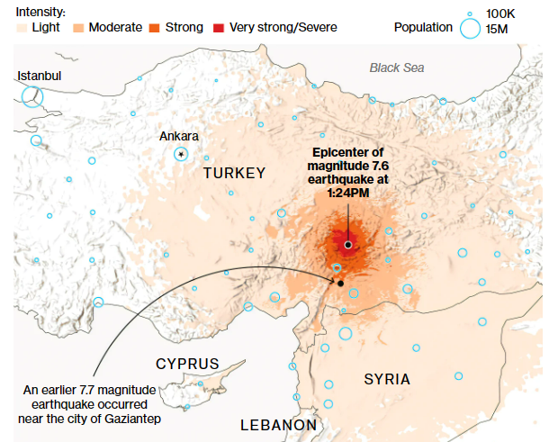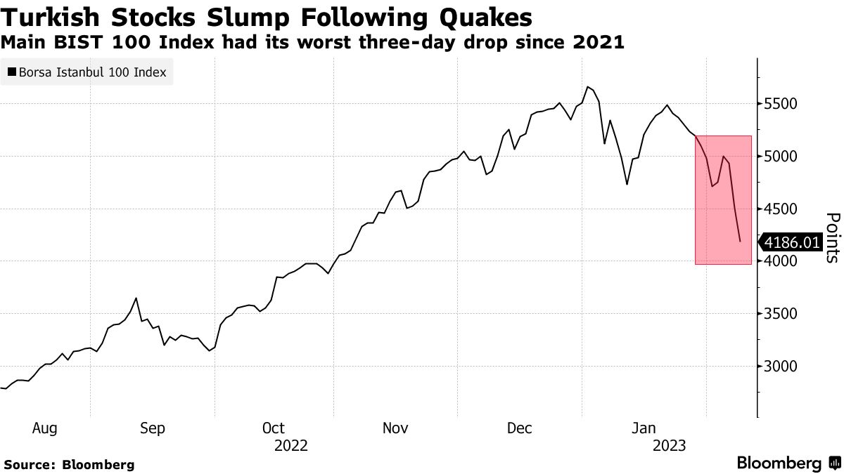 Turkey halted equity market trading. The benchmark Borsa Istanbul 100 Index has lost 16% this week, erasing almost $35 billion from the value of its member stocks, in the aftermath of two deadly earthquakes that struck Turkey’s southern region. Turkish stocks, which are this year’s worst performers globally, entered a technical bear market on Tuesday after falling more than 20% from their January high.