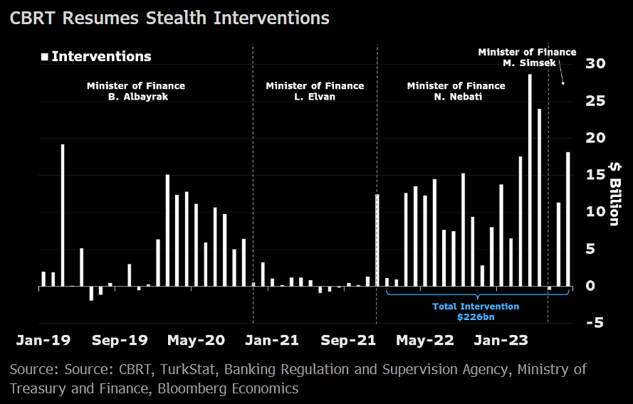 Economist Selva Baziki’s calculations, spanning from January 2022 to August 2023, revealed that TCMB’s “backdoor” forex interventions reached a staggering $226 billion over 20 months. This disclosure was made in a Bloomberg analysis article titled “Secret Interventions Resurface, Totaling $226 Billion,” which was published on the Bloomberg terminal.