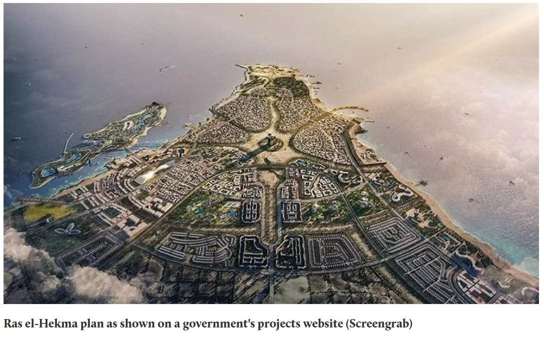 He said that the area of the Ras el-Hekma project is 170 million square metres, and will include residential neighborhoods, tourist resorts, schools, universities, an industrial zone, a central financial and business district, an international marina for tourist yachts, and an international airport south of the city.
