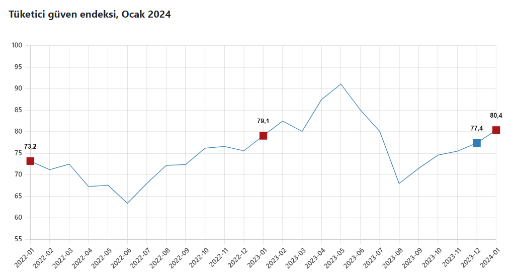 According to the consumer confidence index data for January announced by the Turkish Statistical Institute (TURKSTAT), the consumer confidence index increased by 3.9 percent on a monthly basis in January and became 80.4.