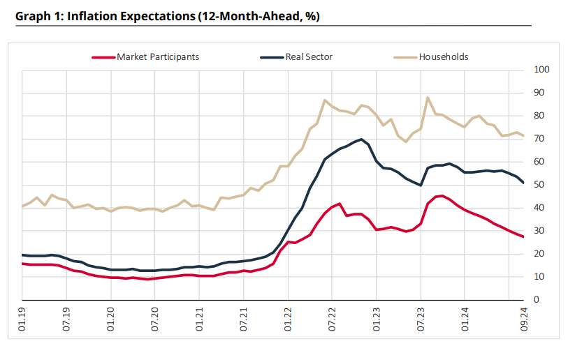 Accordingly, 12-month-ahead annual inflation expectations for September 2024 decreased by 1.2 points to 27.5 percent for market participants, by 2.7 points to 51.1 percent for the real sector and by 1.5 points to 71.6 percent for households.