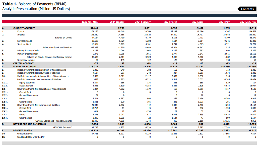 In May, current account recorded net deficit of USD 1,235 million. Goods deficit recorded USD 4,199 million. Gold and energy excluded current account indicated net surplus of USD 3,263 million. Services recorded a net inflow of USD 4,724 million. Under services, travel item recorded a net inflow of USD 3,915 million. Primary income recorded a net outflow of USD 1,607 million and secondary income recorded net outflow of USD 153 million.