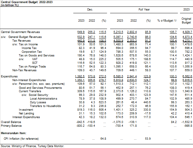 The announced January-December 2023 deficit accounts to 5.4 percent of GDP and falls short of the 6.4 percent expectation. Finance Minister in fact notes that eliminating the expenses related to reconstruction of the quake hit region, the budget deficit to GDP ratio is as low as 1.7 percent.