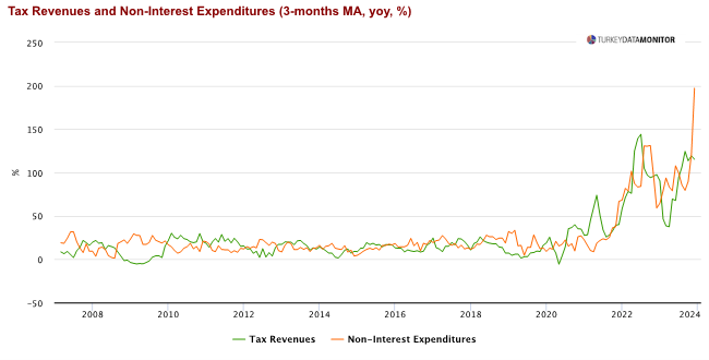In January-December period, budget expenditures amounted to 6.59 trillion liras and budget revenues to 5.21 trillion liras. The growth in expenditures was 124 percent while the rise in revenues was limited to 85,9 percent.