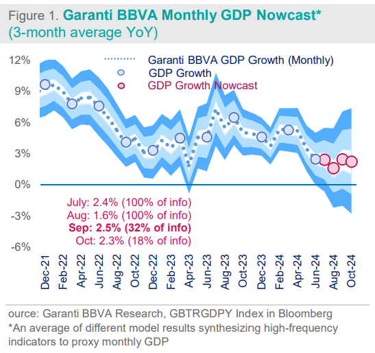 According to Garanti BBVA research, moderation in domestic demand continues in 3Q, while the production side caved in. Garanti expects GDP growth to measure 3.2% YoY and retreat further to 2.7% on restrictive monetary policy, tight financial conditions and expected fiscal consolidation in 2025.