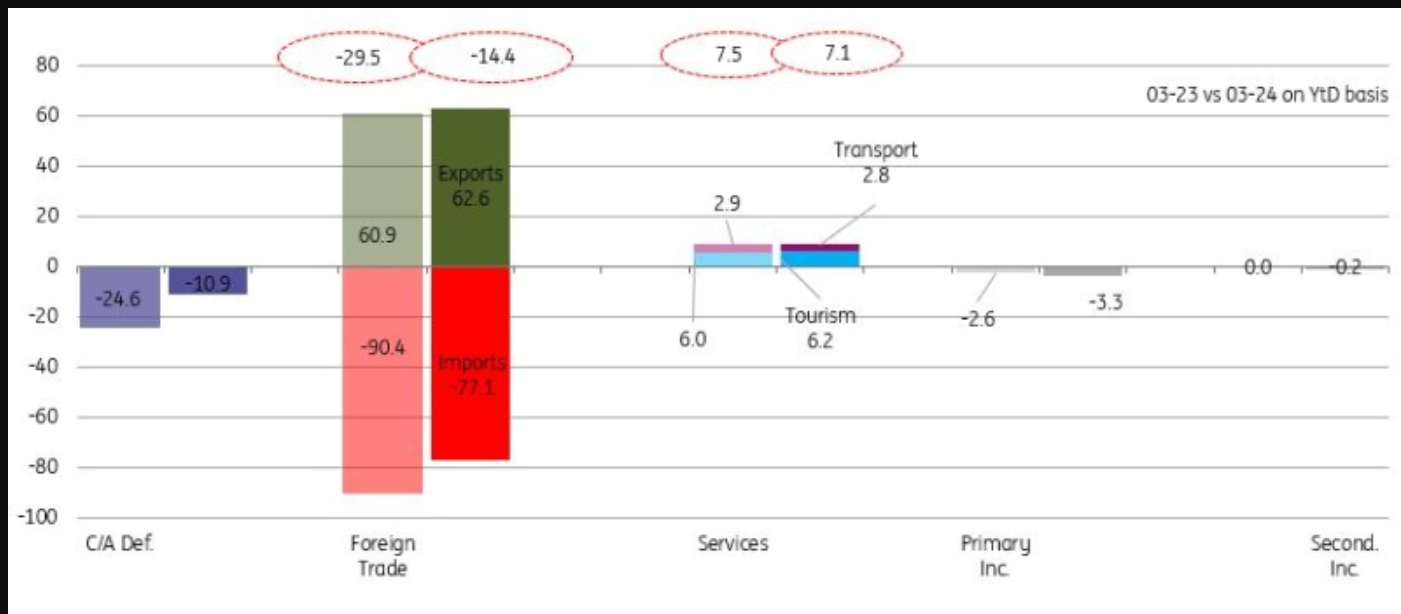 The current account in March posted a deficit of US$4.5bn, while the improvement in the 12-month rolling deficit, which followed a faster pace in the first two months of the year, lost momentum with a modest decline to US$31.2bn (translating into c.2.8% of GDP) from US$31.9bn a month ago, remarked ING Research.
