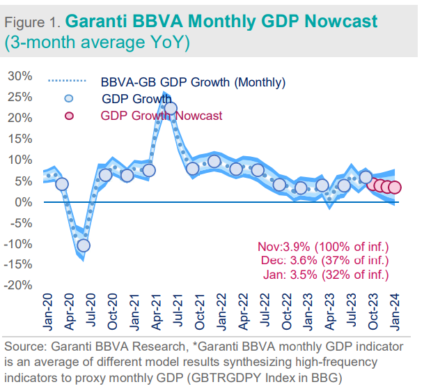 BBVA Garanti Invest publishes the only English language nowcast of the economy. Its February report states “We revise our activity impulse report to become a flash release at the start of each month. By the end of January, our GDP nowcast indicators signal a nearly stagnant quarterly GDP growth rate, which corresponds to an annual growth of 3.5%. We keep our 2024 GDP growth forecast at 3.5% after realizing nearly 4.5% in 2023”.