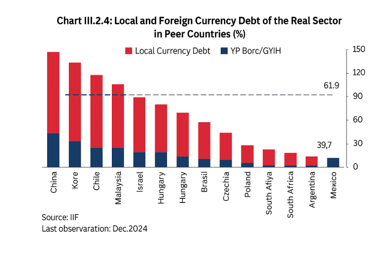 A recent chart published by the CBRT comparing local vs. foreign currency corporate debt across peer countries places Turkey near Hungary and Czechia, both of which also have high FX exposure.