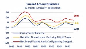 Summary: Türkiye’s current account returned to surplus in October, supported by strong services revenues despite a widening foreign trade deficit. Direct investment flows recorded the sharpest monthly outflow since 2014, while portfolio and other investment categories showed a mixed performance. Economists expect the current account to maintain a modest improvement heading into year-end. Current Account … Continue reading ANALYSIS: Türkiye Posts October Current Account Surplus as Services Revenues Surge