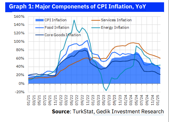 Inflation in durable goods and other core goods remained subdued, coming in at 1.1% and 1.3% MoM, respectively. Annual inflation in these categories stands at 19.6% and 27.0%, significantly below headline inflation, supported by the real appreciation of the Turkish lira. In contrast, services inflation—the most rigid component—remains elevated at 59.8% YoY.