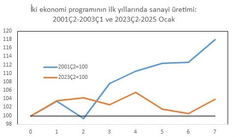 A comparison of industrial production under two different economic programs illustrates the shortcomings of the current approach. One example is the Transition to a Strong Economy Program, launched in May 2001. The other is the Return to Rationality Program, introduced in June 2023. A review of seasonally and calendar-adjusted industrial production index values by quarter reveals stark differences in outcomes.