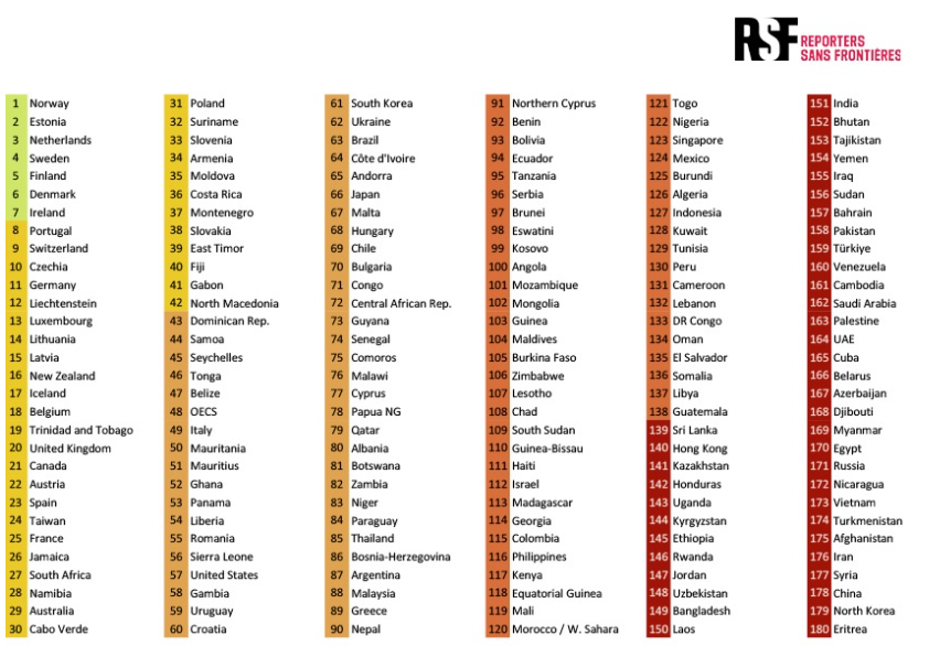 Additionally, aid freezes by USAID pushed hundreds of media outlets—especially in Ukraine (62nd)—to the brink of closure.