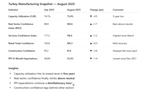 Turkey’s Central Bank (CBRT) August 2025 data shows that the slowdown in the manufacturing sector continued, with the seasonally adjusted capacity utilization rate (CUR) falling 0.5 points to 73.6%, marking its lowest level in five years. While temporary production halts in the automotive sector contributed to the decline, excluding these effects, the overall trend remained broadly stable. Meanwhile, business confidence showed a slight recovery, but investment appetite and employment trends weakened further.