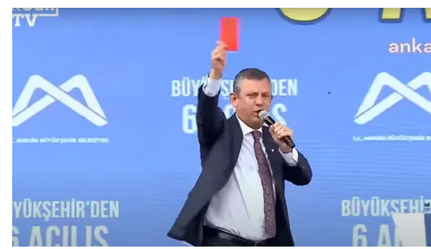 During a rally in the Mediterranean coastal province of Mersin, Turkish main opposition CHP leader Özel showed a “red card” to President Erdoğan, criticizing the hike in the pensions and minimum wage, which were lower than the annual inflation rate.
