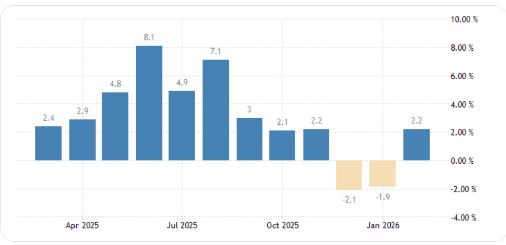 This marked a recovery following a 2.9% contraction in January and a modest increase in December.