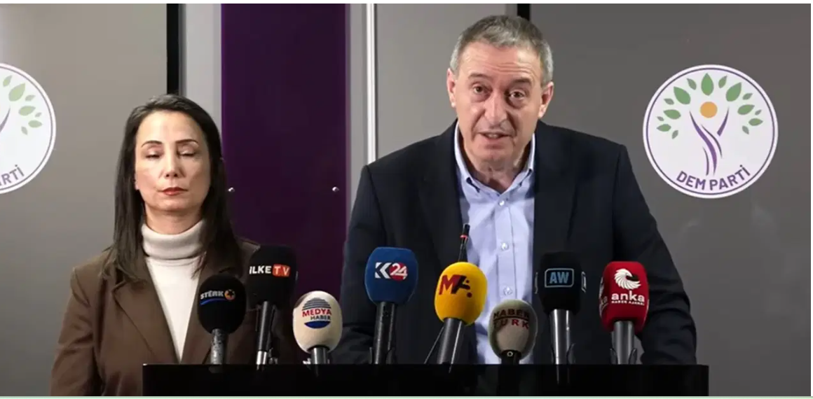 The co-chairs of the Peoples’ Equality and Democracy Party (DEM Party), Tülay Hatimoğulları and Tuncer Bakırhan, held a press conference at the party’s headquarters to address recent clashes in Syria’s Aleppo province, where groups aligned with Hayat Tahrir al-Sham have been conducting operations in neighborhoods previously controlled by the Syrian Democratic Forces.