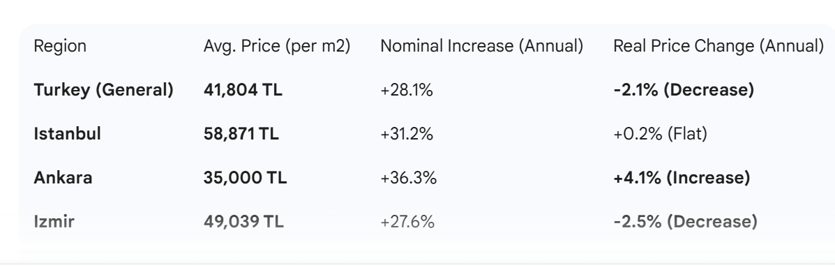 While nominal (current) prices continue to rise—with Istanbul leading the way at nearly 59,000 TL per square meter—the “real” value (inflation-adjusted) has dropped by 2.1% nationwide. Izmir saw the sharpest real decline at 2.5%, while Ankara remains an outlier with a 4.1% real increase, signaling continued strong demand in the capital.
