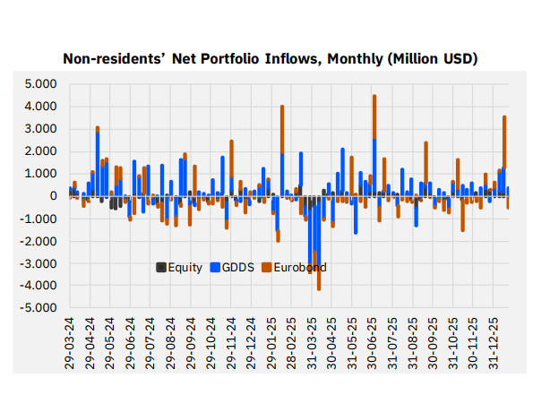 By contrast, the Treasury Eurobond market recorded approximately USD 500 million in net foreign sales, reducing the outstanding stock to around USD 81.8 billion.