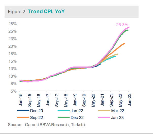 According to BBVA Garanti research, stable currency helped absorb some upward pressure from strong demand, but weakening but continuing cost push factors, second round effects and inertia kept the level high. Increasing populism in terms of expansionary policies and wage adjustments further boosts consumption, resulting in more sticky services prices. Therefore, the deceleration in annual inflation proved to be much lower than anticipated. BBVA Garanti economists expect annual CPI to come down to 55% on average in 1Q23 and decline further to 40-45% in May just before the elections. Inflation outlook in the second half of the year will depend on the adjustment in economic policies and therefore the exchange rate. Its tentative forecast for year-end inflation is 42%.