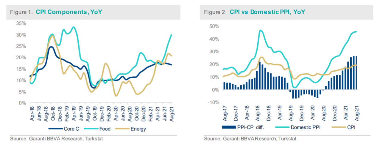 Although recent stable levels of the exchange rate provide some relief, cost push factors remain on track due to strong commodity prices and supply side problems. Also, still growing domestic demand and worsening inflation expectations facilitate pass-thru over the consumer prices, keeping the risks on the upside for inflation. We expect consumer inflation to stay close to 19% till November and then decline to near 17% at the end of the year, which leaves almost no room for an easing from the CBRT. But, given the recent CBRT communication, we still expect rate cuts in November and December, ending up with a policy rate of 18% at the end of the year.