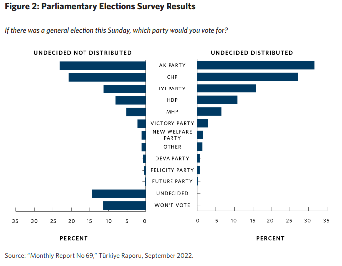 A similar picture is emerging in the parliamentary race. According to the September 2022 survey of Türkiye Raporu, support for the AK Party is at the historic low of 22.2 percent (excluding undecided voters). The CHP is second with a support level of 20.5 percent. Afterthe undecided voters are accounted for, the AK Party vote rises to 29.7 percent, with the CHP at 27.2 percent and the İYİ Party at 16.7 percent. The AK Party’s parliamentary ally, the MHP, is at 7.4 percent.